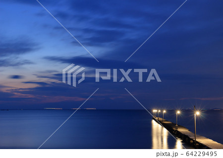 ブルーアワーの空と富士山のシルエットを背景にした南房総原岡桟橋の風景 Ver1