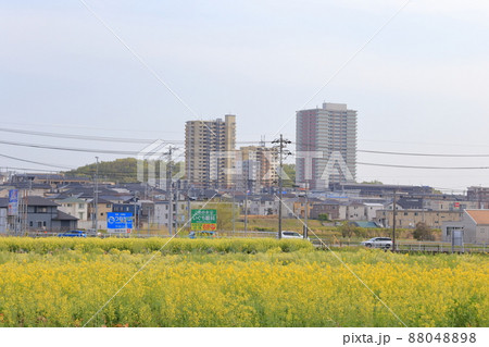 菜の花と街並み(愛知県 日進市 米野木町)