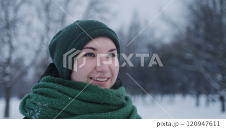 Winter portrait of happy smiling young woman in forest with snow on Christmas tree background