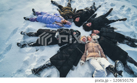 Schoolgirls having fun in the snow, creating snow angel shapes and posing for a winter photo shoot outdoors