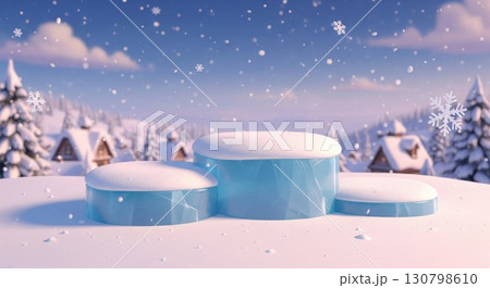 Winter Podium in Snowy Landscape with Three Icy Stages and Falling Snowflakes