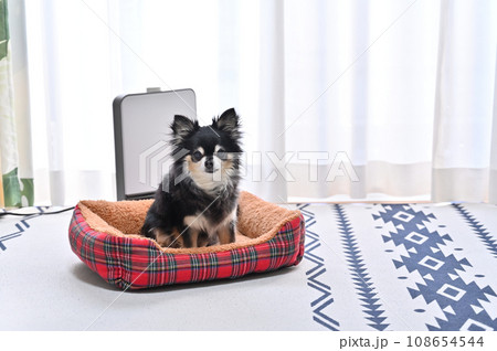 犬用ベッドでリラックスしながなセラミックヒーターで温まるチワワ