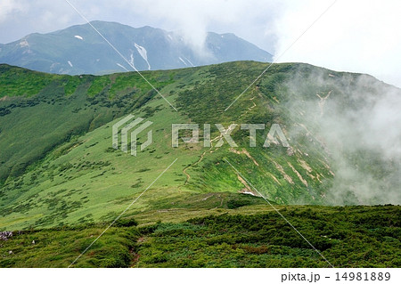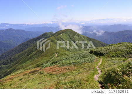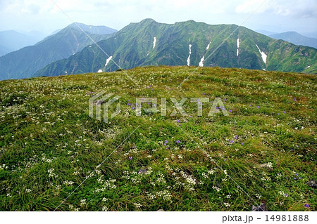 高山植物咲く朝日連峰・寒江山付近の稜線
