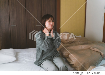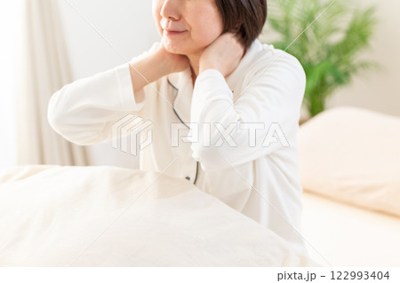 パジャマを着て寝室で肩こりに苦しむミドル女性
