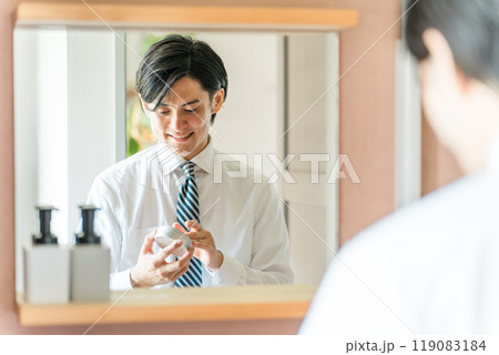 朝出勤前にヘアセットするスーツ姿の若いアジア人男性ビジネスマン