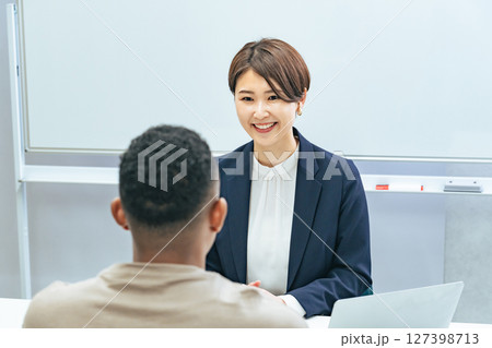 黒人男性と面談する日本人女性スタッフ