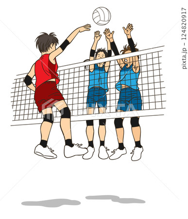 アタックをする男子バレーボール選手とそれをブロックする相手チームの選手