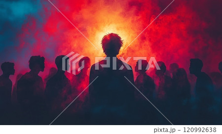 confident figure stands glowing core crowd shadowy shapes showcasing power self identity and empowerment compelling abstract style.