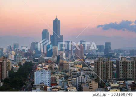 台湾 高雄市、寿山情人観景台から見る夕暮れの街並み