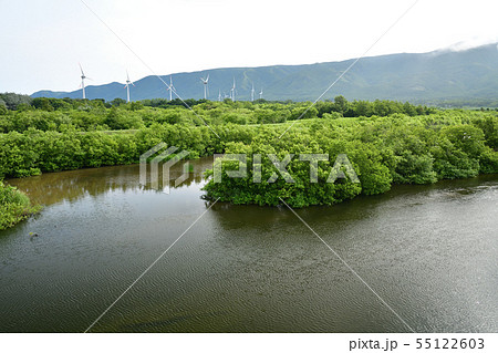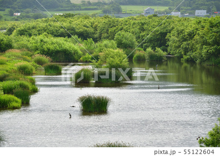 北海道寿都町に流れる朱太川河口付近の夏の風景を撮影