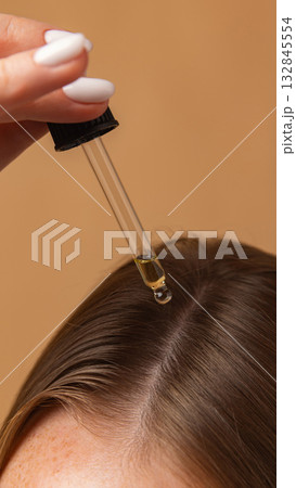 Dropper applying nourishing oil to scalp for strengthening hair roots