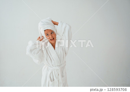 Having fun. With towel on head. Conception of beauty and self care. Young girl is in the studio