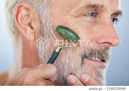 Elderly man, jade roller and face for skincare with smile, self care and wellness in studio by white background. Elderly model, facial massage and beauty with stone product, cosmetic and dermatology