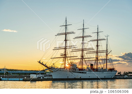 富山県射水市 富山新港 美しい朝日とオアシス海王丸パークに係留される帆船海王丸