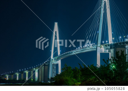 闇夜にライトアップされた光が輝く新湊大橋の夜景|富山県射水市