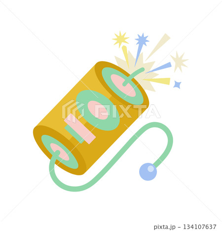 Cartoon depiction of a firecracker with blue and yellow stripes, fuse, and flower explosion.