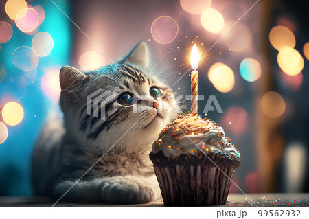 Cute little kitten with birthday cupcake on festive bokeh background. Generative AI illustration