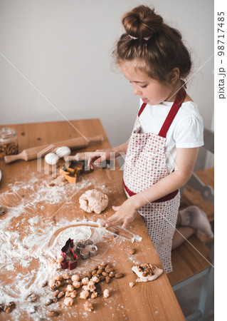 Little child girl 4-5 year old cooking ginger cookies in kitchen closeup. Winter season. Childhood.