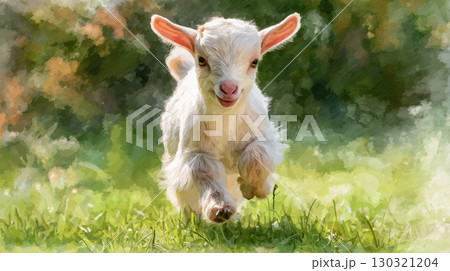 Playful young goat kid with white fur joyfully jumps on green grass in bright outdoor setting with blurred natural background