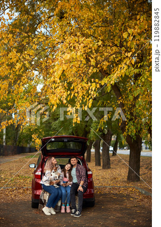 Happy parents with daughter and cute dog Jack Russel terrier sitting in car trunk on autumn day
