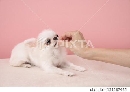 ピンクバックとおやつをもらうチワワ