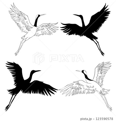 Wild birds in flight. Animals in nature or in the sky. Cranes or Grus and stork or shadoof and Ciconia with wings. engraved sketch hand drawn in vintage style.