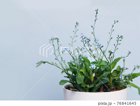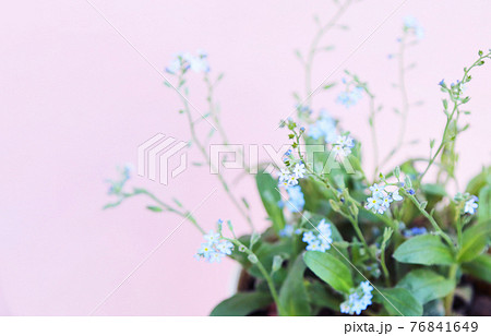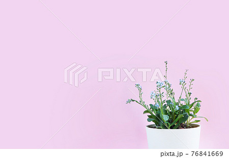 青く小さい花、鉢植えわすれな草とピンク色の春カラー背景