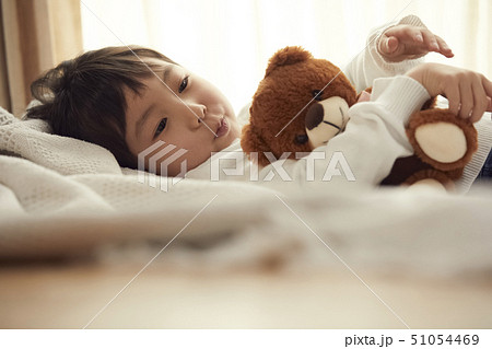 ベッドで小さなクマと寝る女の子