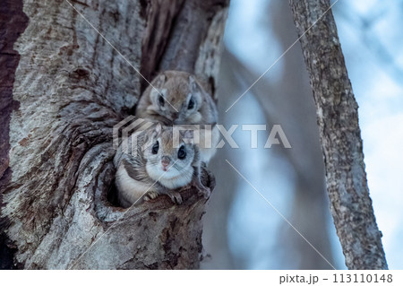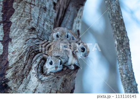 巣穴から顔を出した二匹のエゾモモンガと樹皮を食べる二匹のエゾモモンガ