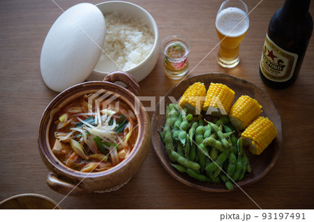 熱々の純豆腐チゲとライス、とうもろこし、えだ豆、ビール