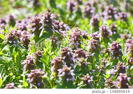 早春の野原に咲くヒメオドリコソウとホトケノザ