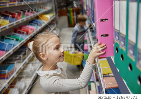 Little schoolgirl selecting paper document archive folder in stationery store