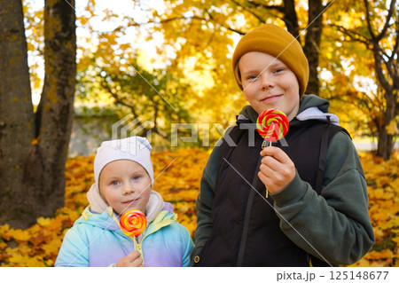 Portrait of a boy and a girl eating lollipops in an autumn park.