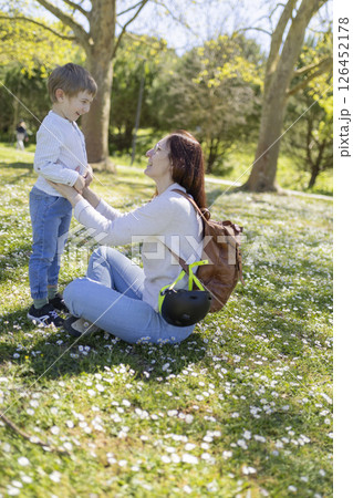 Mother kneeling on grass holding her son's hands in park