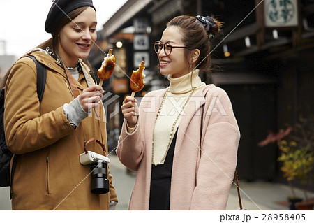 古い町並み 五平餅を食べる外国人女性と日本人女性