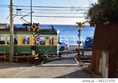 鎌倉・腰越の江ノ電の踏切と相模湾