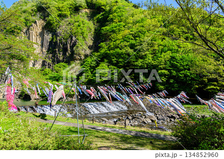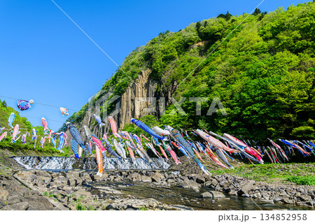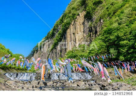 鯉のぼりと小原の材木岩(宮城県白石市)