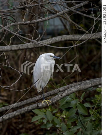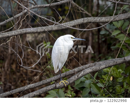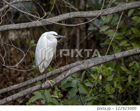 稲毛海浜公園の松の木で休憩する白い鳥はコサギ