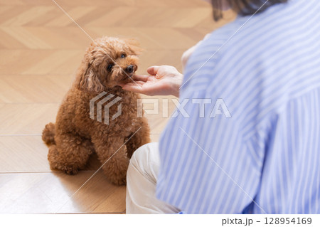 立たされて少し不服そうな我が家の愛犬ショコラ