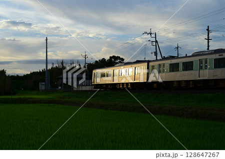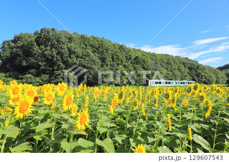 烏山線「ひまわり畑を走る列車」夏の青空背景に