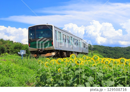 烏山線「ひまわり畑と夏空の下を行く列車」