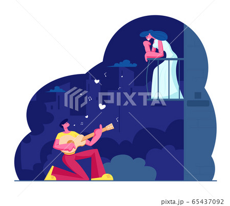 Man Play Guitar Sing Serenade to Woman Website Landing Page. Girl Listen Music on Balcony at Night. Couple Love Relationship, Romantic Evening Date Web Page Banner. Cartoon Flat Vector Illustration