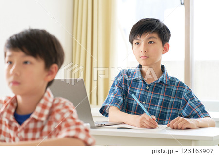 真剣な表情で勉強中の高学年男子