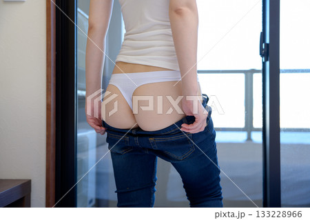 ベッドに寝ながらデニムパンツをはく女性のお尻 美尻 ダイエットイメージ スレンダー