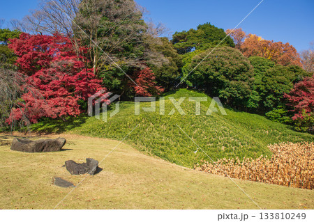 秋晴れの空の下で紅葉した木々に囲まれた緑鮮やかな築山 (東京都、文京区、小石川後楽園)