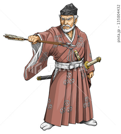 3本の矢を持った戦国武将の毛利元就 線画 筆文字付