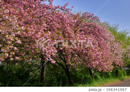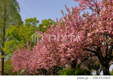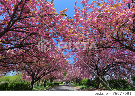 埼玉県川越市川越水上公園 ボート池の周りを彩る満開の八重桜の並木