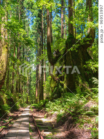 屋久島国立公園のきれいな森を走るトロッコ線路(7月)