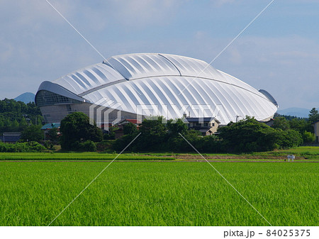 夏の青空と農村エリアに建つ大きなこまつドーム|石川県小松市