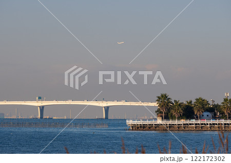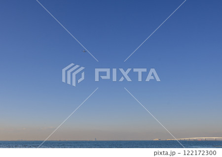 アクララインと羽田空港から離陸する飛行機が見える木更津の青い海